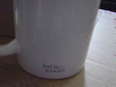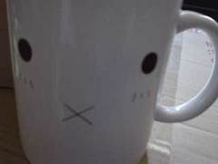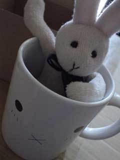 お約束のように、マグカップの中に入ってみたウサ。 前回のと、色が違うだけウサ。 あんまり居心地は変らないウサ。