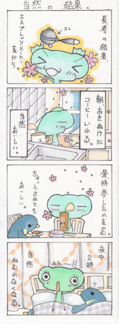 夜中の2時にさっぱり眠れなくなり、そのまま朝を迎えるカエル。